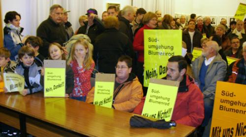 Am fraglichen Termin erschienen dann auch spontan etwa 120 Bürger die ihren Protest kundtun wollten. Plakate mit Bekundungen wie "Südumgehung Blumenrod - mit uns nicht!" wurden im Vorfeld kurzfristig gedruckt und vor dem Rathaus an die Bürger verteilt. Der Besucherraum des Rathauses konnte die Massen gerade noch aufnehmen. Etwa 30 Minuten harrten die 120 Protestierenden im Zuhörerraum aus, bevor die friedliche Demonstration vom Organisations-Team der Bürgerinitiative aufgelöst wurde.